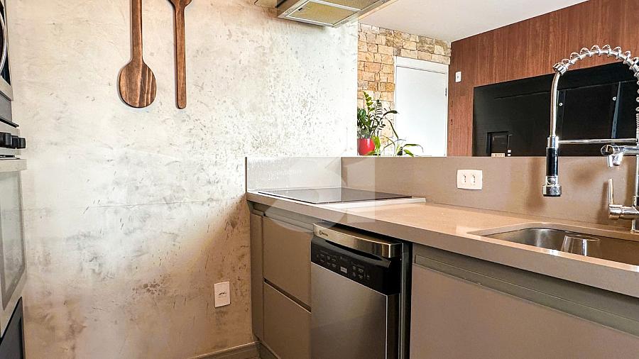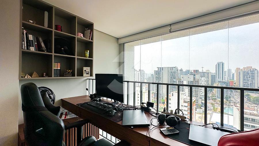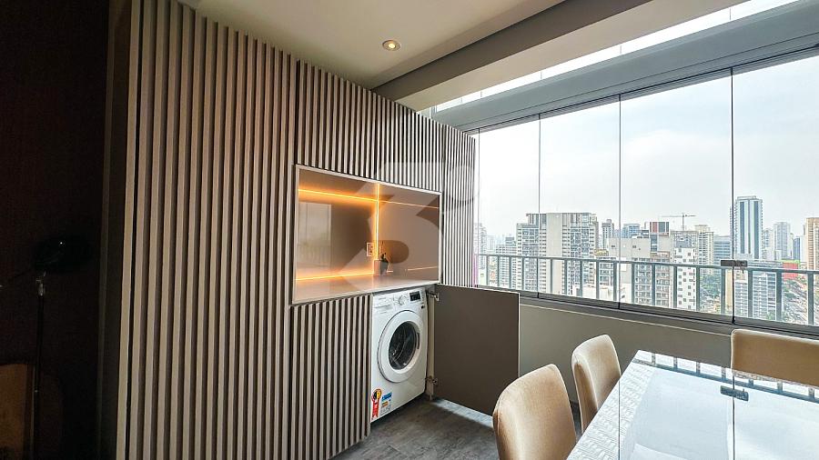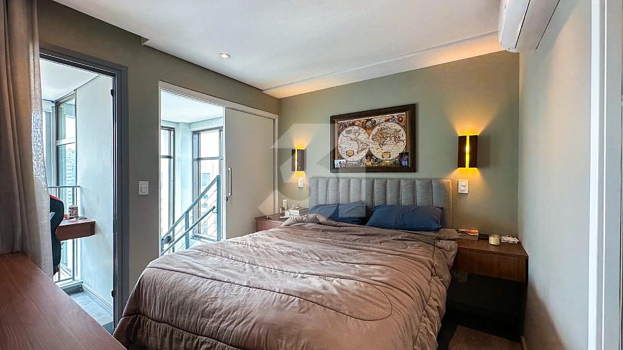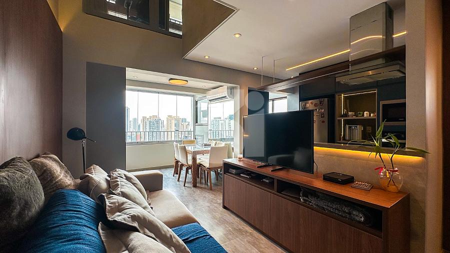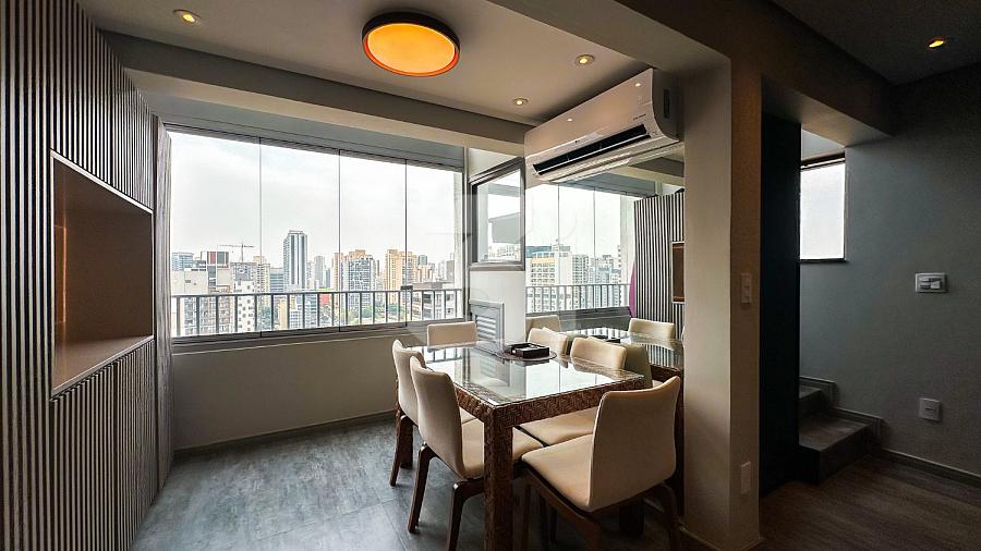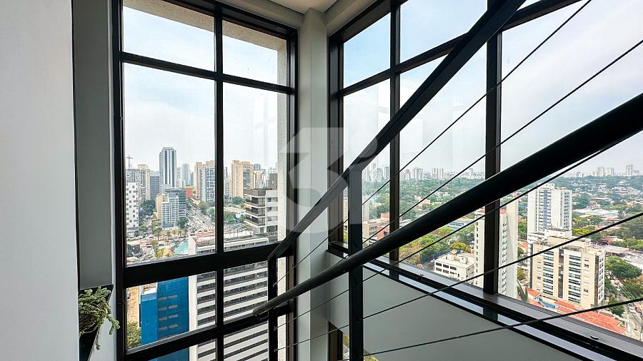 Loft para venda e locação no Brooklin, com 61m², mobília completa, pé direito duplo, 1 dormitório no mezanino, banheiro e lavabo, armários planejados, cozinha americana, varanda e uma vista privilegiada.