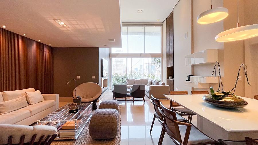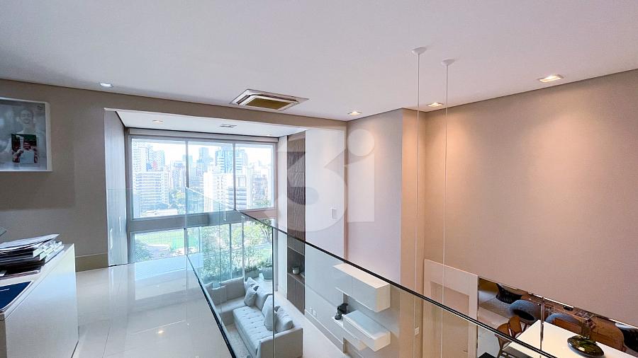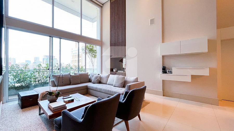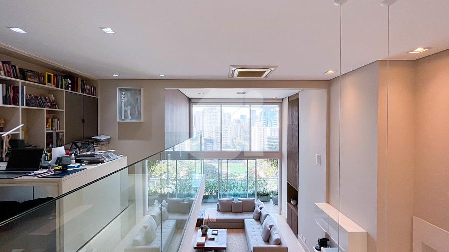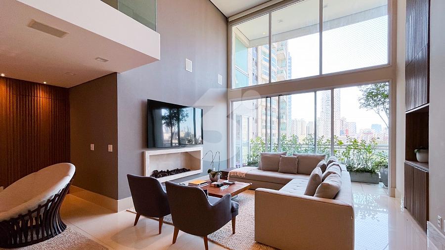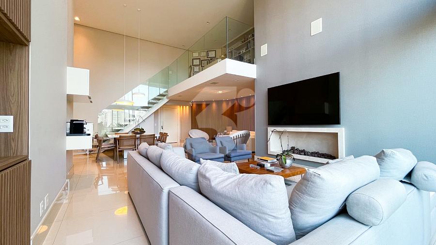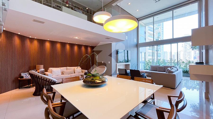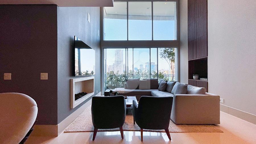 Apartamento para venda no Brooklin, com 210m², pé-direito duplo, mezanino com home office, 3 dormitórios, sendo 2 suítes, 5 banheiros, 1 lavabo, suíte máster com banheiro sr e sra, living amplo, cozinha com armários planejados e varanda com uma vista panorâmica.
