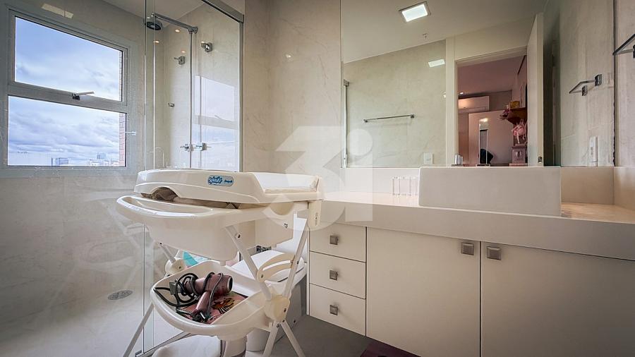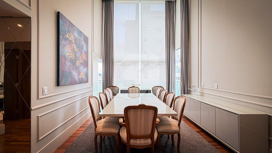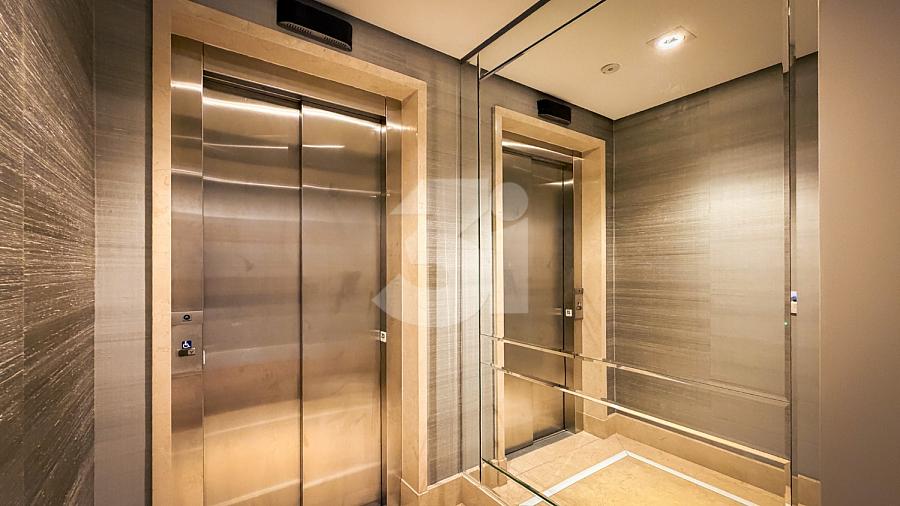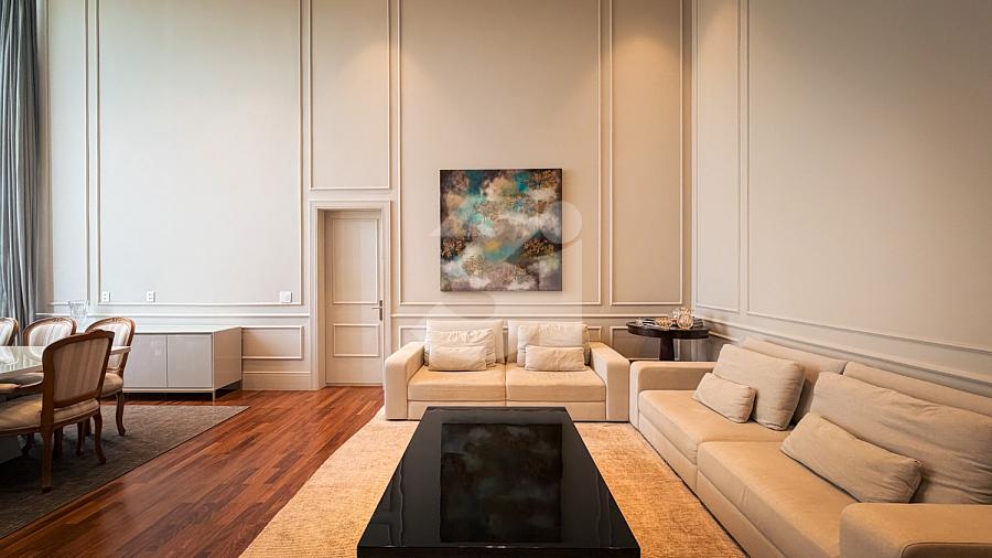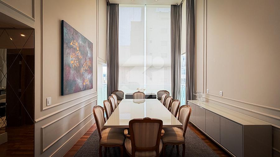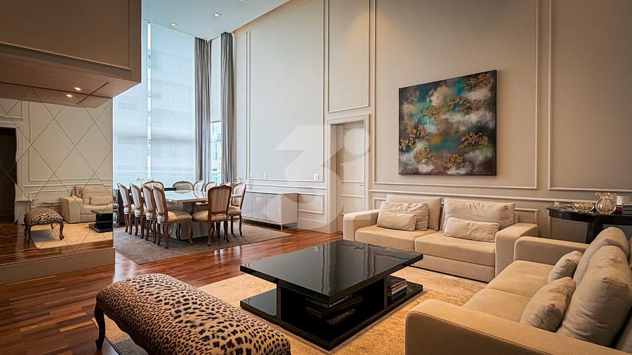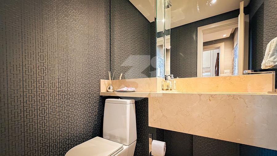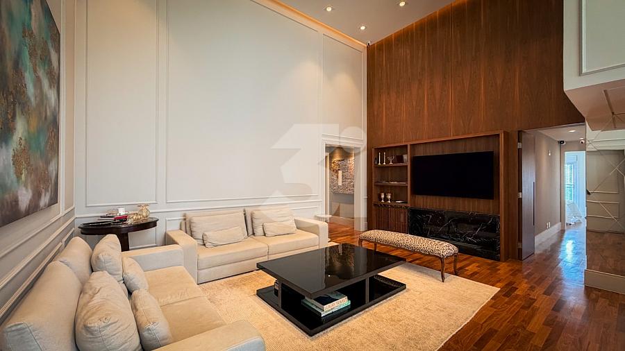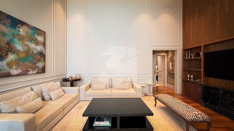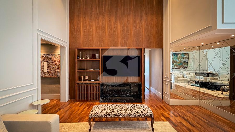 Apartamento de alto padrão com elevador social privativo, acabamentos nobres em mármore e madeira, marcenaria Florense e metais Deca. Área social com iluminação dimerizável, lareira, ar-condicionado central e persianas motorizadas. Ambientes climatizados, janelas acústicas nas suítes, duas áreas técnicas e 3 vagas de garagem.