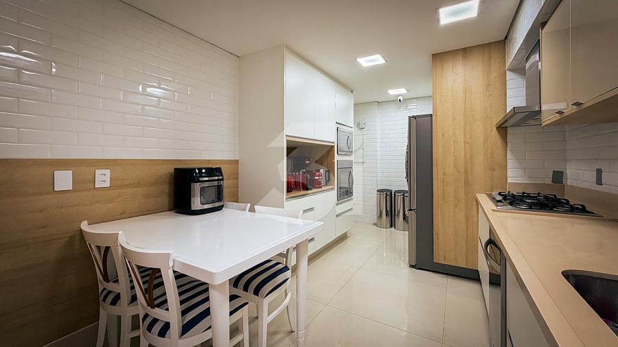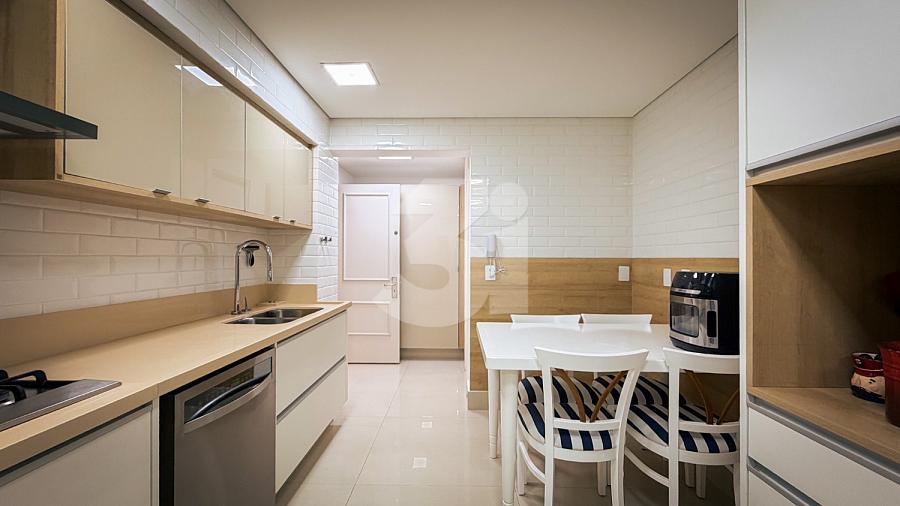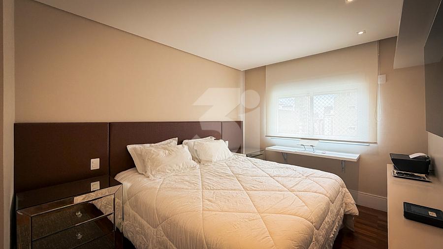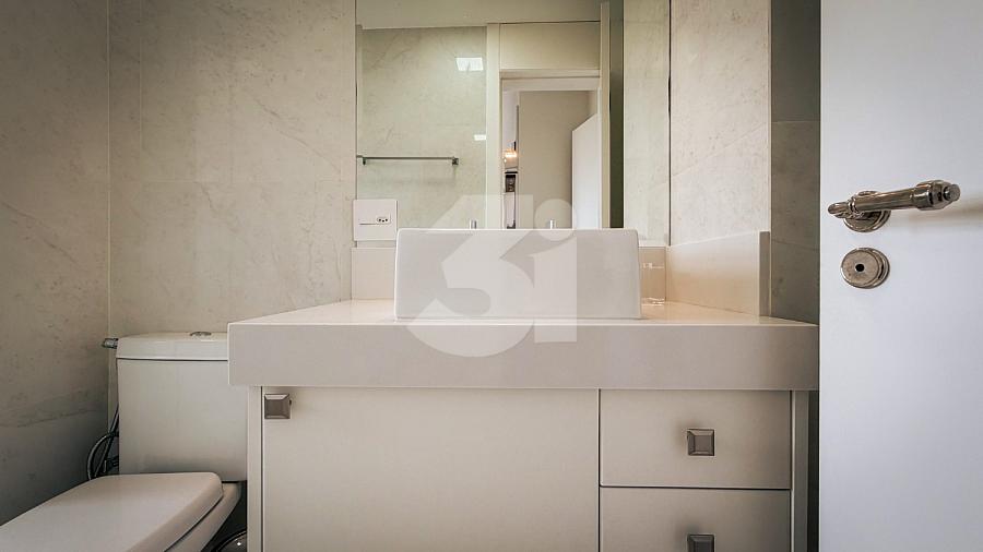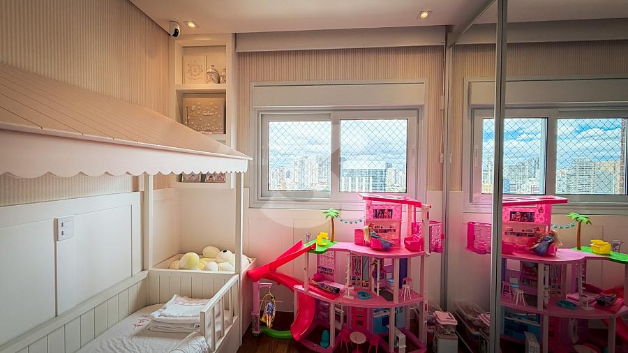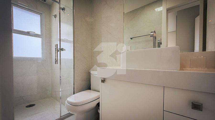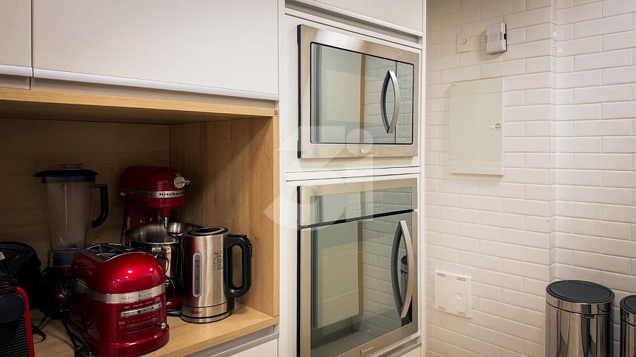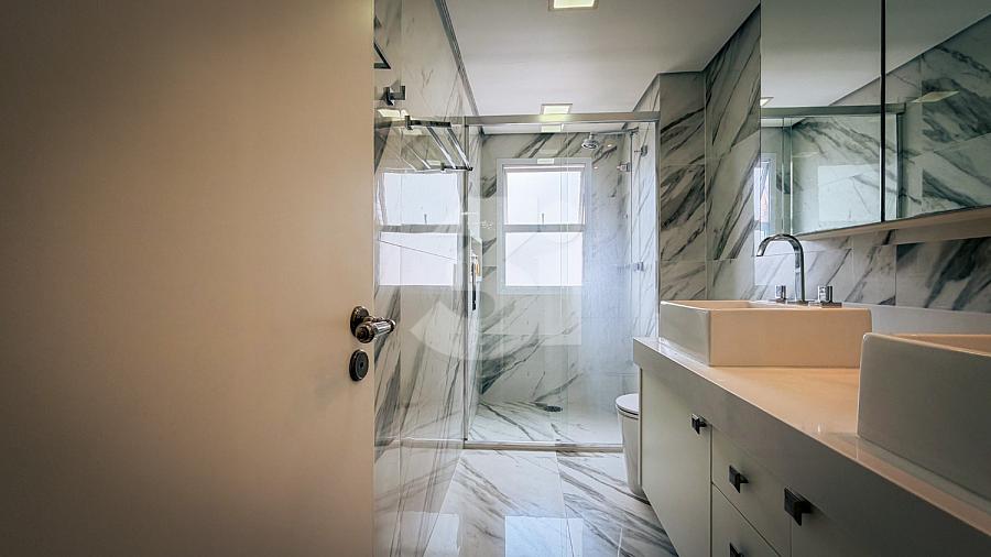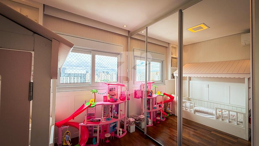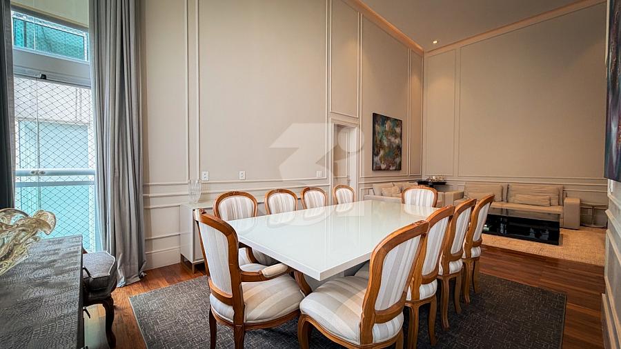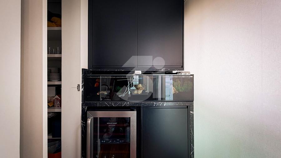 Apartamento de alto padrão com elevador social privativo, acabamentos nobres em mármore e madeira, marcenaria Florense e metais Deca. Área social com iluminação dimerizável, lareira, ar-condicionado central e persianas motorizadas. Ambientes climatizados, janelas acústicas nas suítes, duas áreas técnicas e 3 vagas de garagem.
