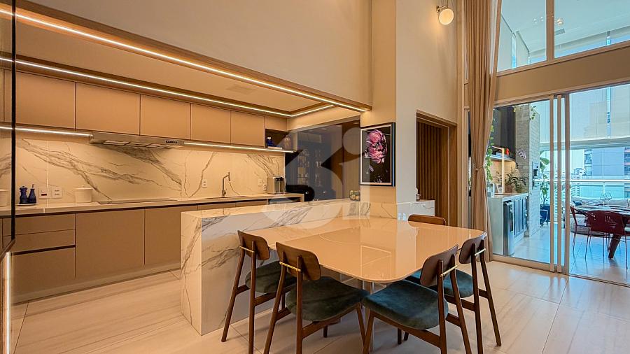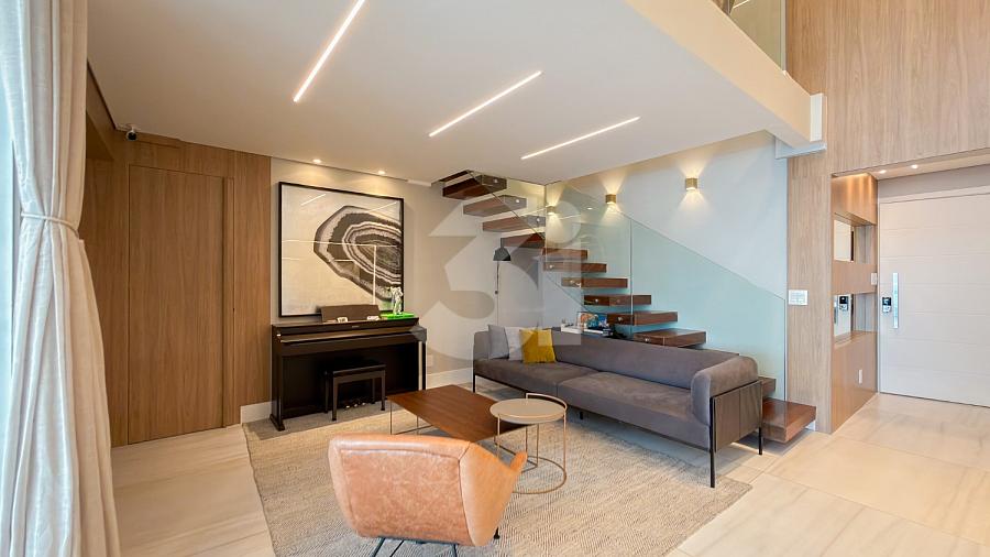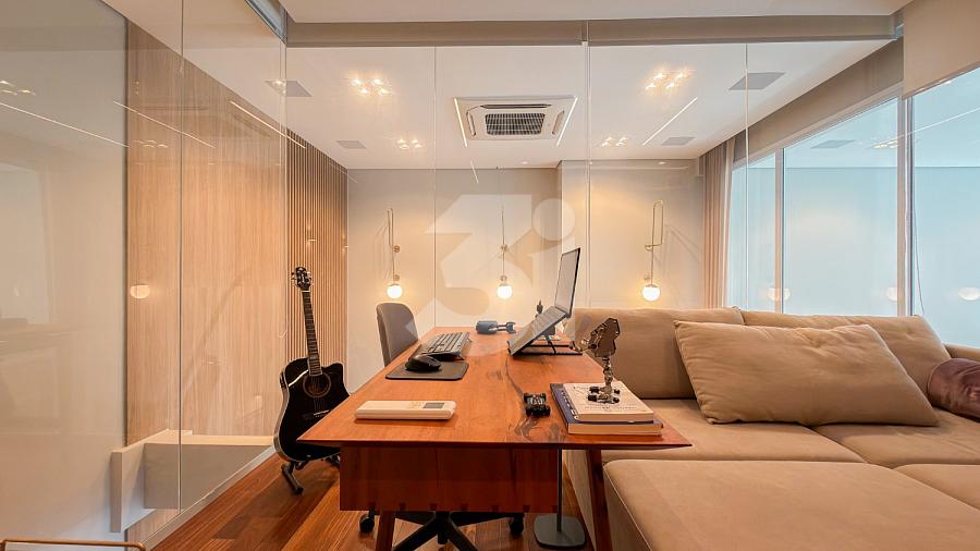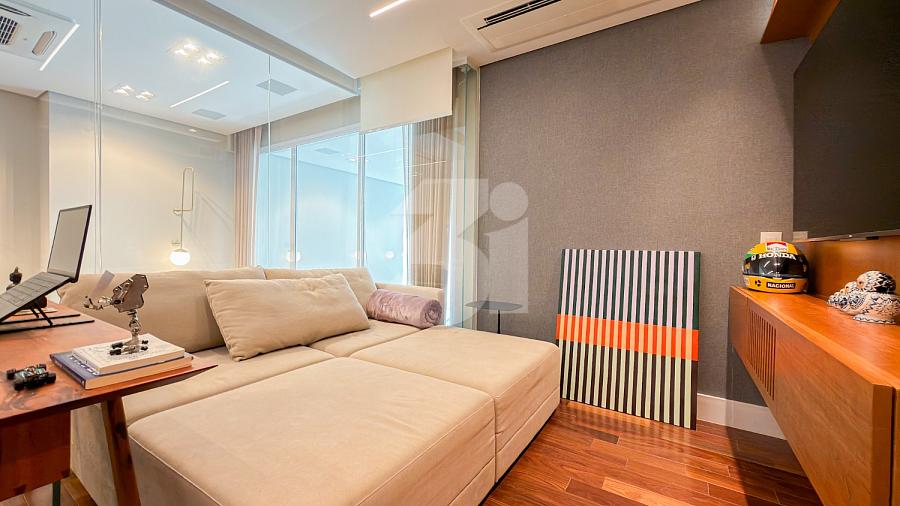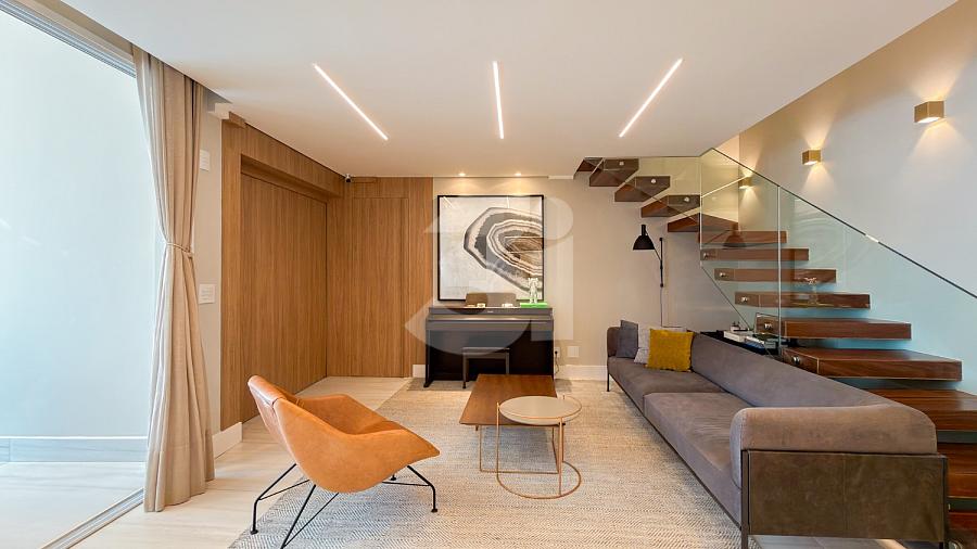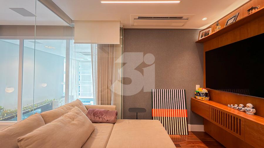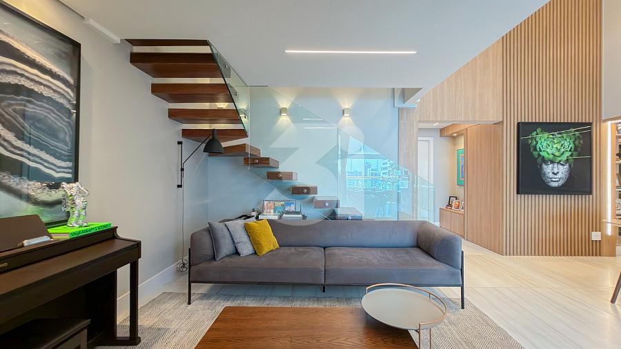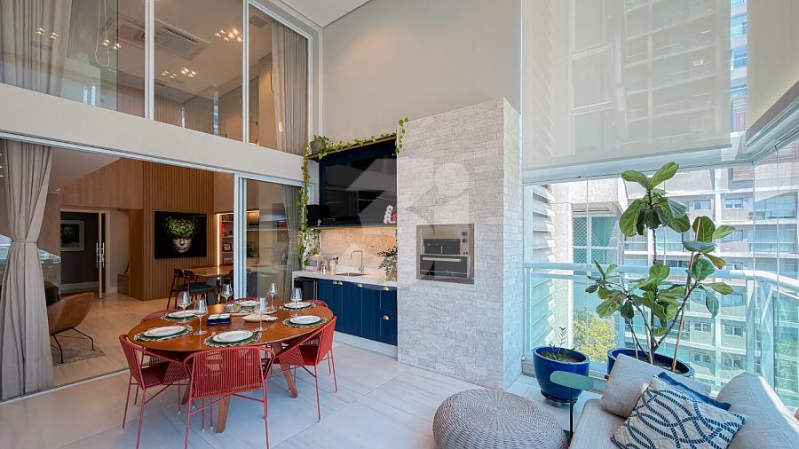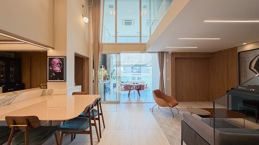 Apartamento à venda no Brooklin, com 197m², 4 dormitórios, sendo 4 suítes, living amplo, pé-direito duplo, sala de TV, mezanino com home office, cozinha americana e varanda.