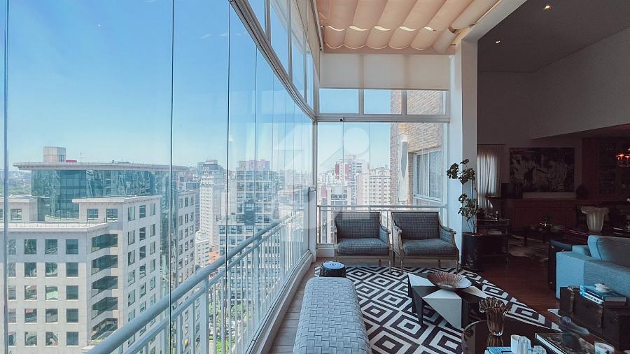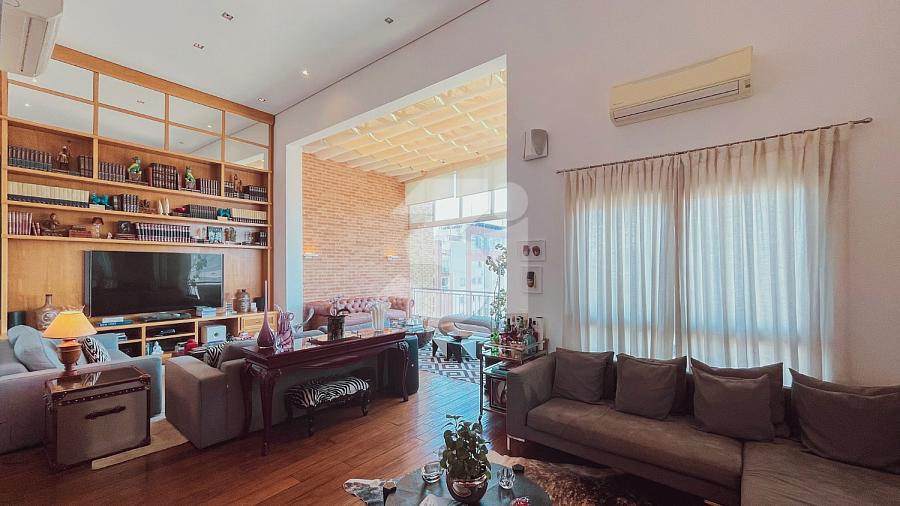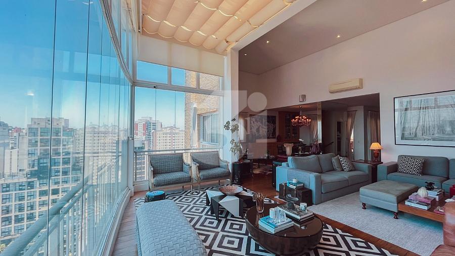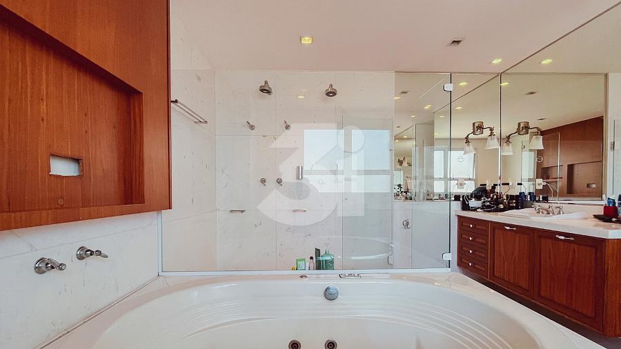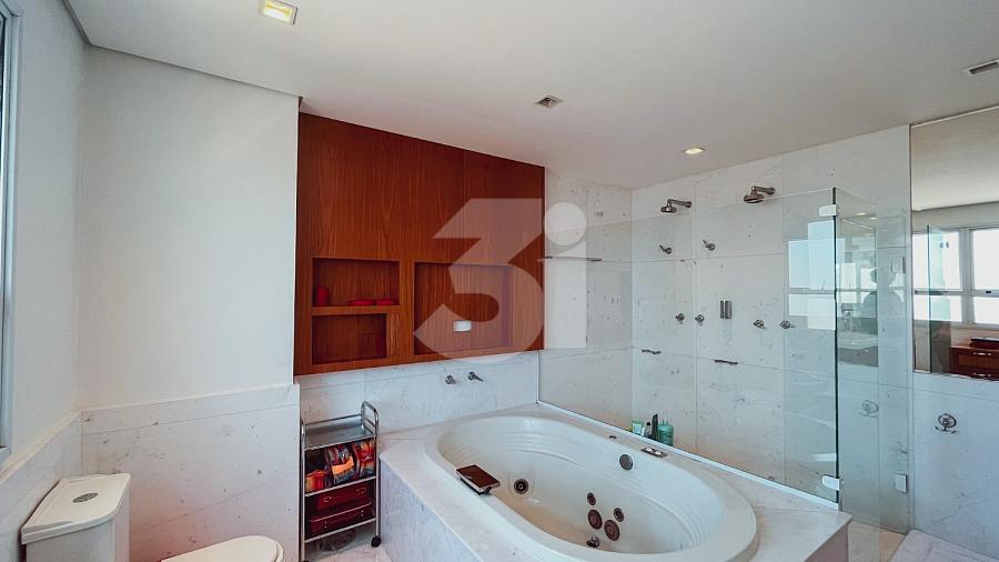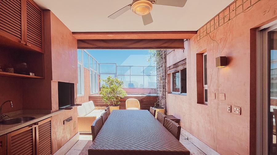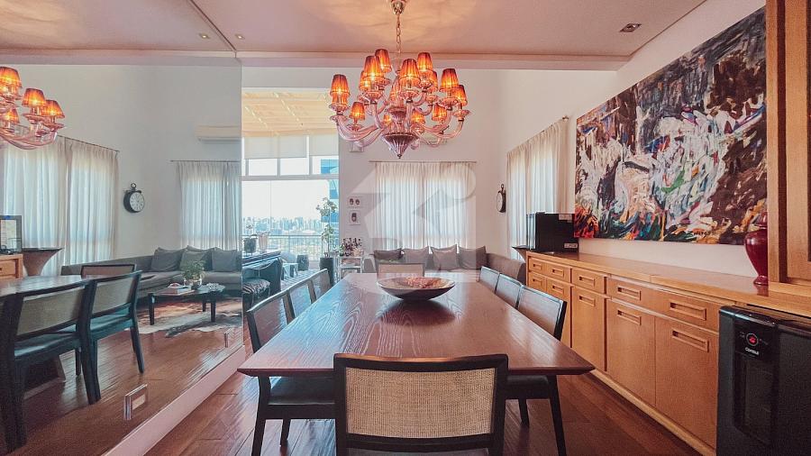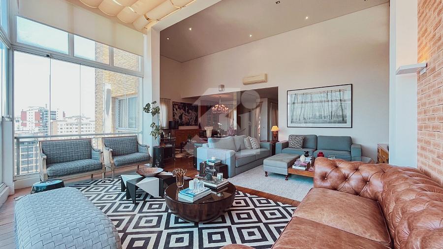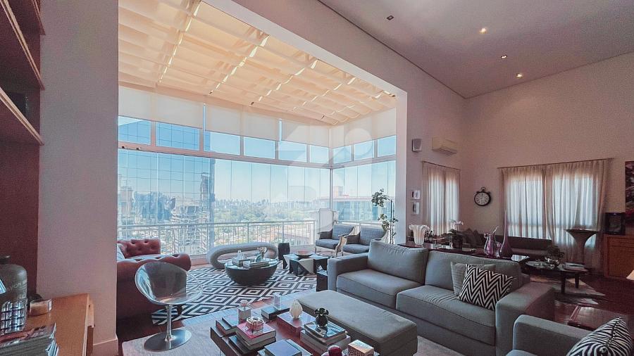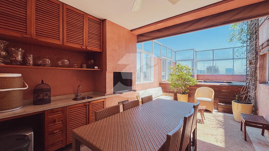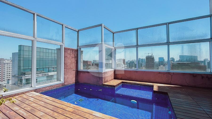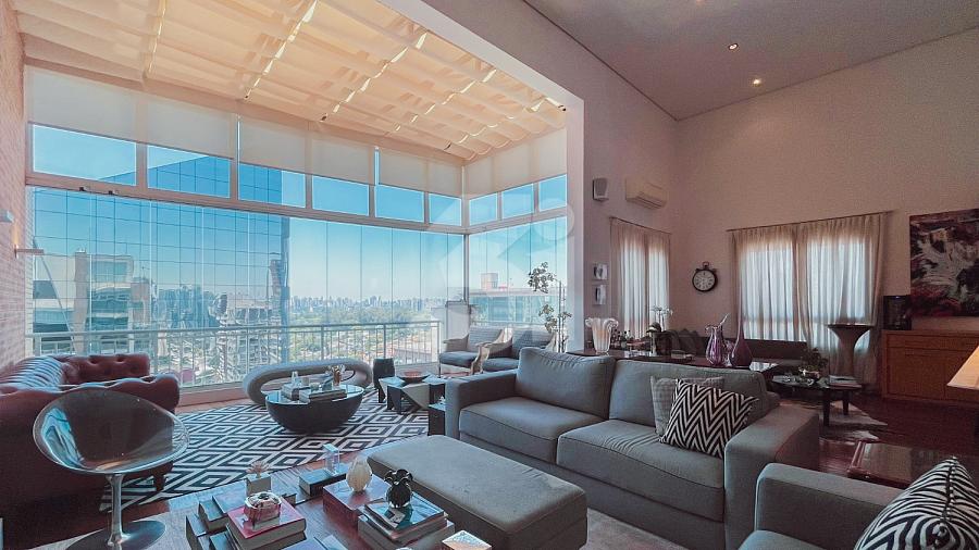Cobertura duplex para locação no Itaim Bibi, com 363m², 3 dormitórios, sendo 3 suítes, closet, banheira, pia com cuba dupla, sala de TV, living amplo com pé-direito duplo, cozinha e área de serviço com armários, dependência de funcionários, varanda com churrasqueira, piscina privativa e uma vista privilegiada.
