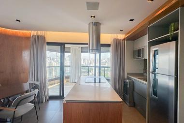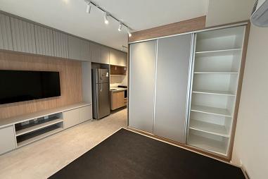 Studio para Locação na Vila Olímpia, com 1 dormitório, 1 banheiro, cozinha americana, fechadura eletrônica, varanda com vista privilegiada e 2 vagas de garagem.