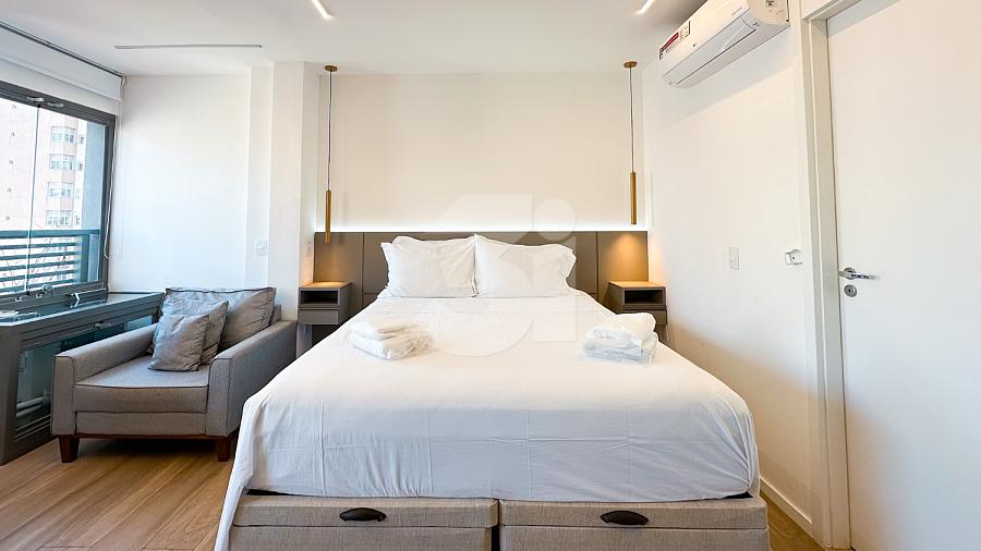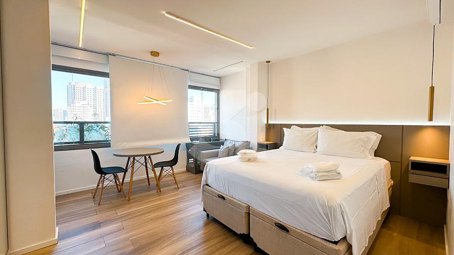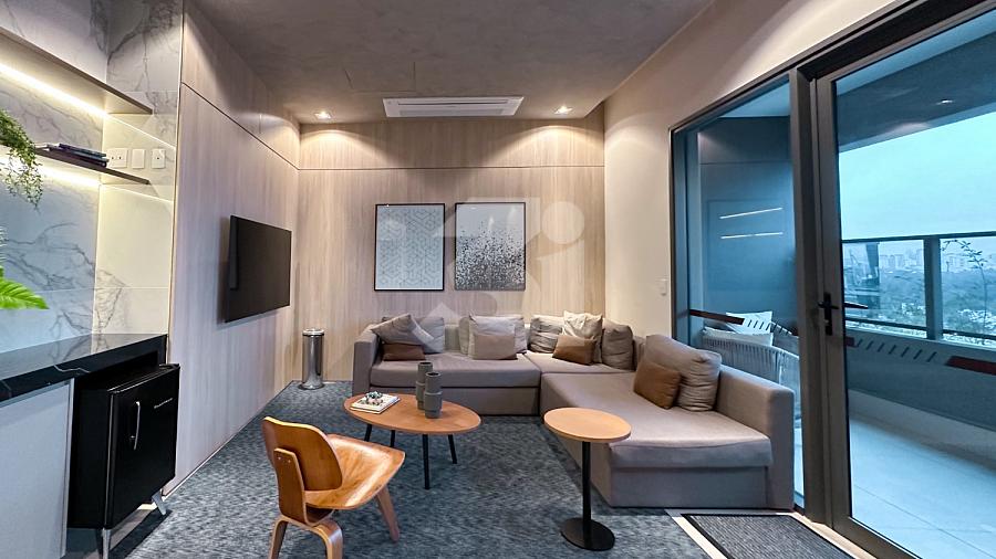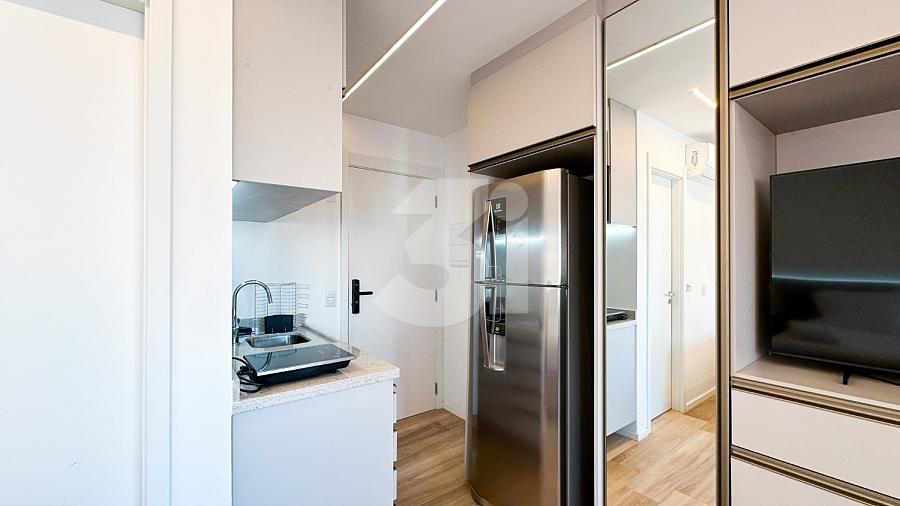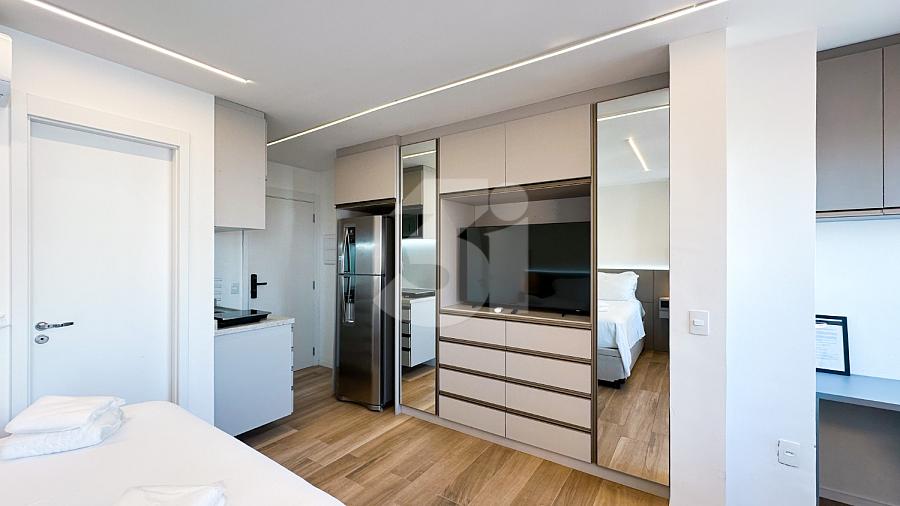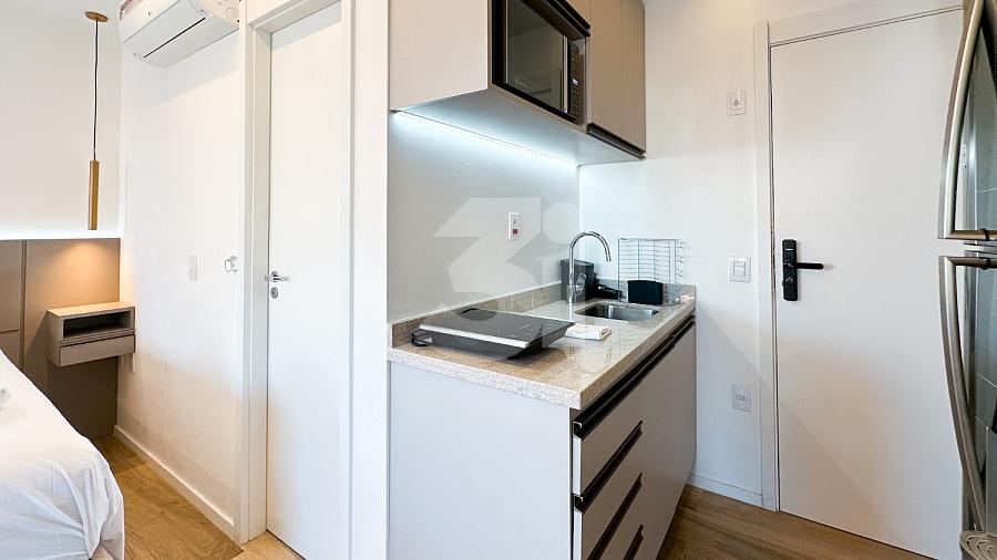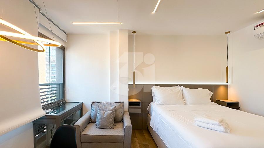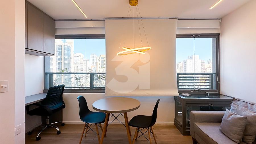 Apartamento mobiliado para venda no Itaim Bibi, andar alto, com 29m², mobiliado, cozinha com armários planejados, 1 dormitório, 1 banheiro e varanda ampla com uma vista privilegiada.