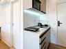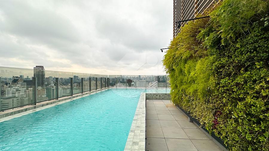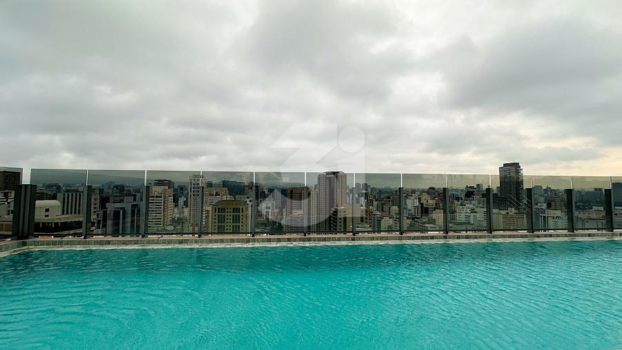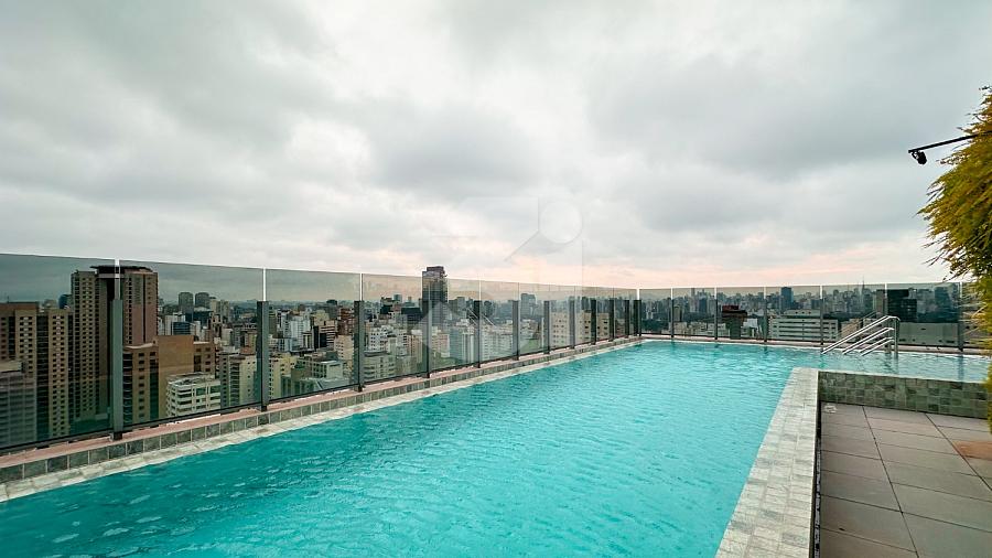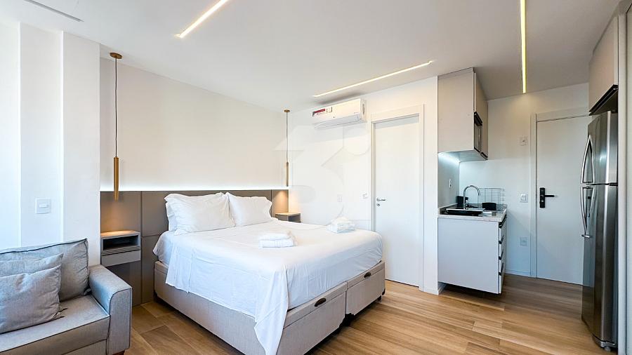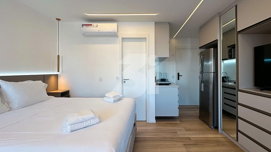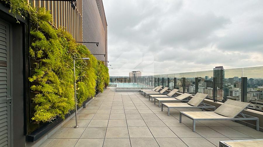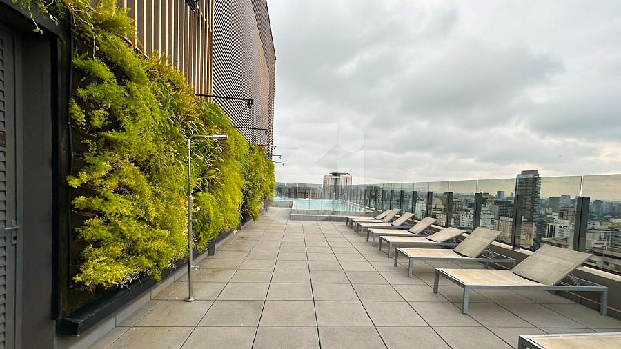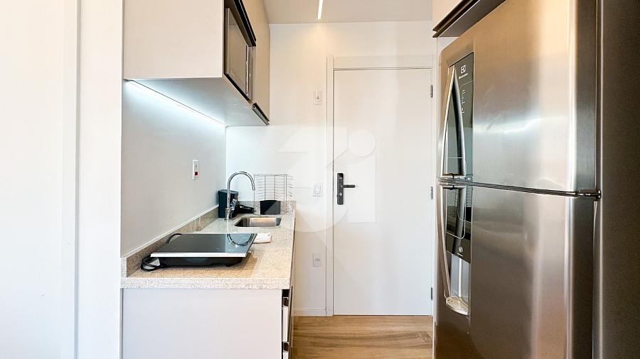Apartamento mobiliado para venda no Itaim Bibi, andar alto, com 29m², mobiliado, cozinha com armários planejados, 1 dormitório, 1 banheiro e varanda ampla com uma vista privilegiada.
