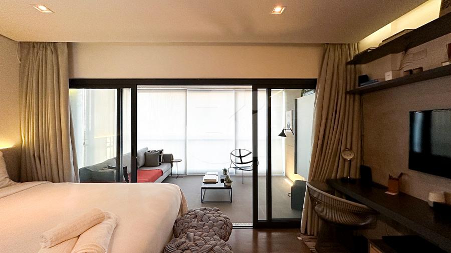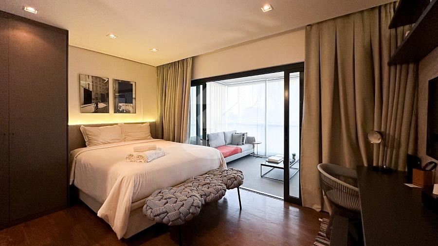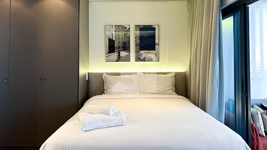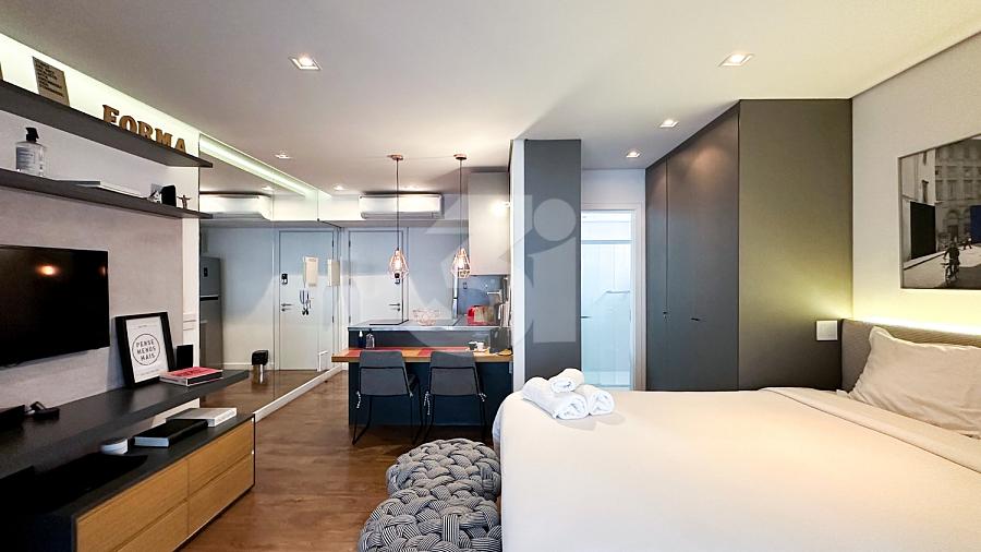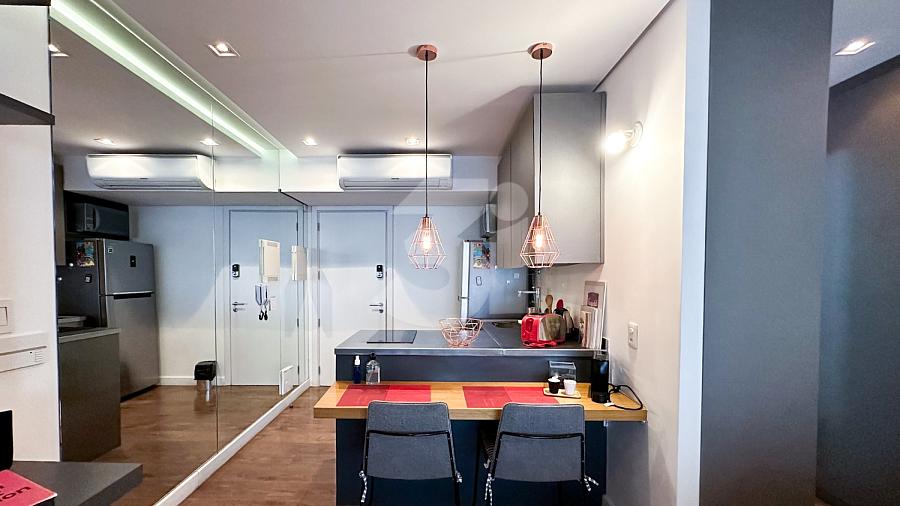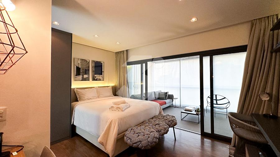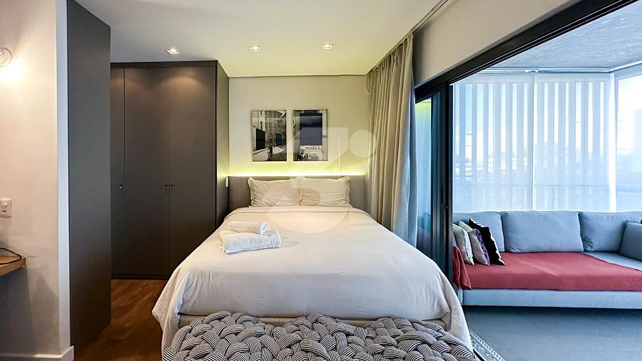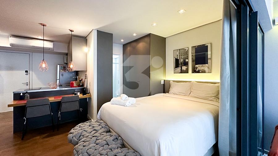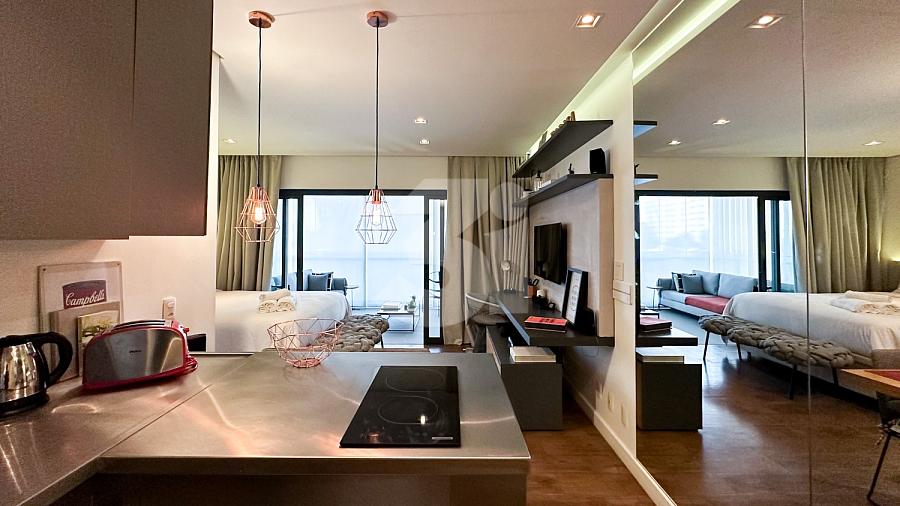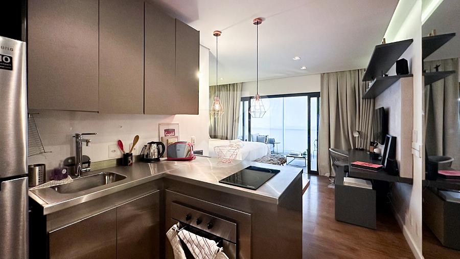 Studio para venda no Itaim Bibi, completamente mobiliado, com 45m², cozinha americana com armários planejados, 1 dormitório, 1 banheiro e varanda ampla com uma vista privilegiada.